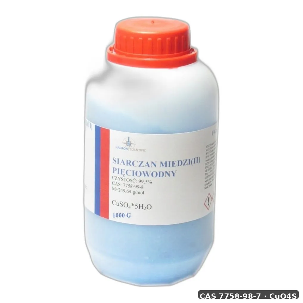 Niebieski proszek o wzorze CuSO₄·5H₂O, czystość 99,5%. Szeroko stosowany w laboratoriach, rolnictwie i domowych pracach chemicznych.